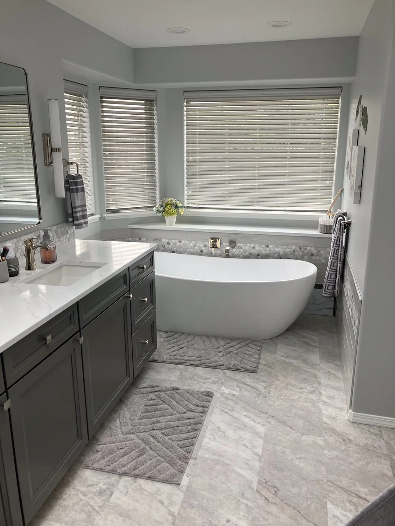 Refreshing a 25-year-old floor plan without sacrificing its sophisticated sanctuary feel. Replaced an outdated jacuzzi with a sculptural freestanding tub and adding natural stone to the floor with tiled wainscot accent wall surround.